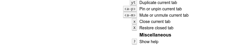 | yt | 复制当前标签页,即再打开一个与当前标签页相同的页面 |